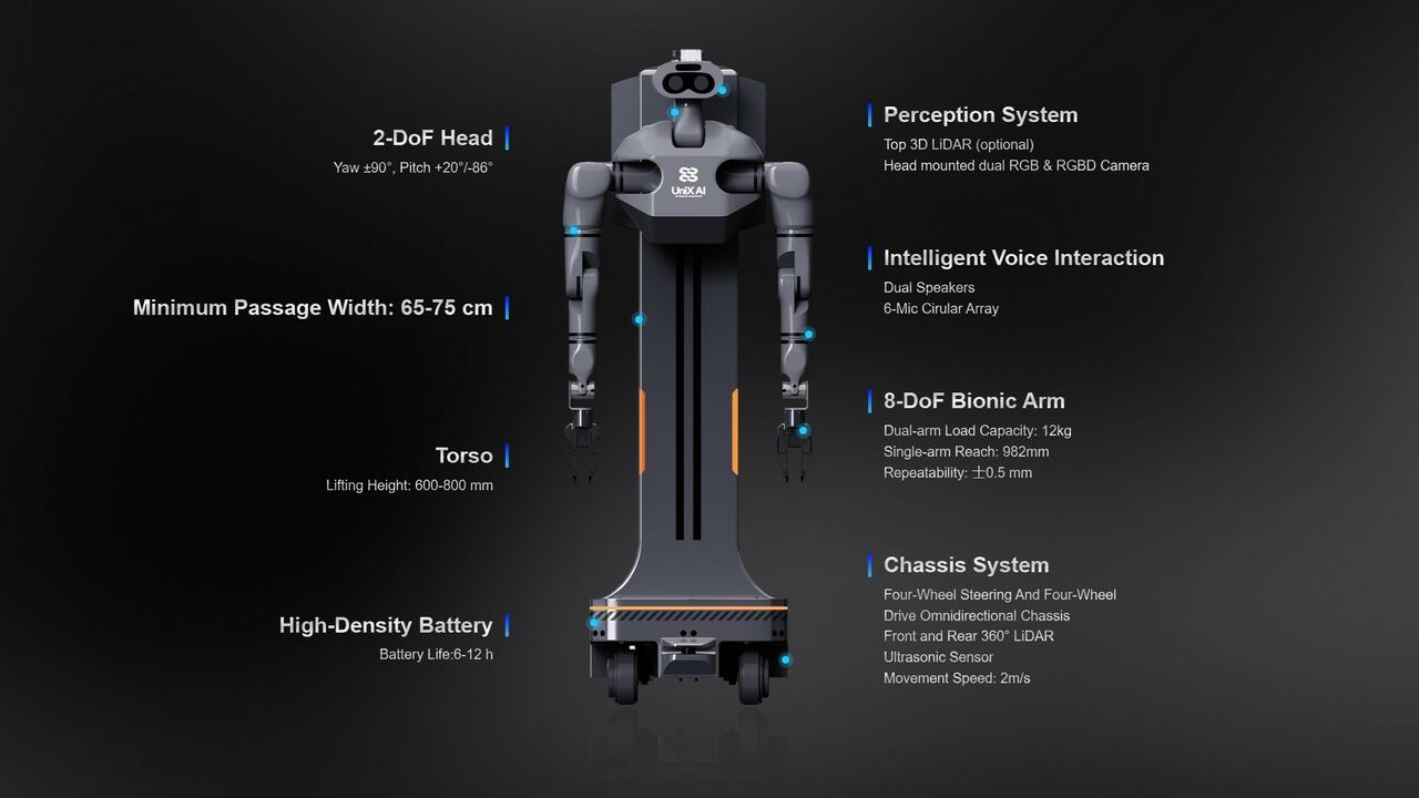 According to UniX AI, the robot features 34 high-degree-of-freedom joints, including the world’s first mass-produced 8-DoF bionic arms and adaptive intelligent grippers, allowing precise and flexible manipulation.