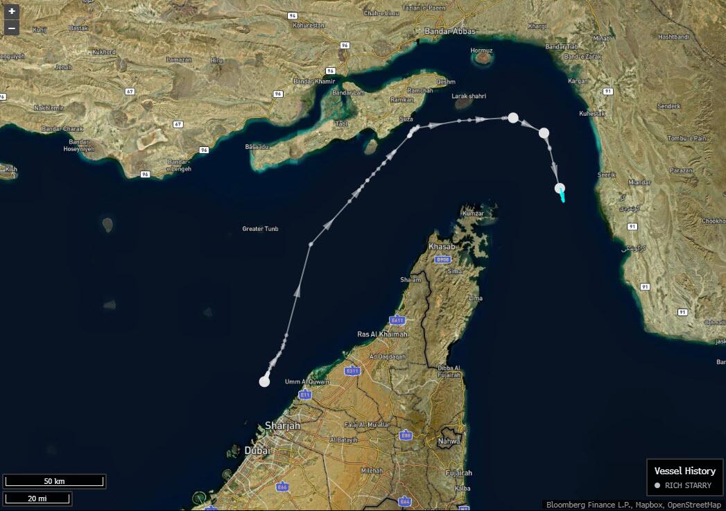 Rich Starry, a 188-meter medium-range tanker earlier known as Full Star, was blacklisted by Washington in 2023 for helping Tehran evade energy sanctions. It was not clear on this occasion whether it visited Iranian ports before its transit, or is carrying cargo.