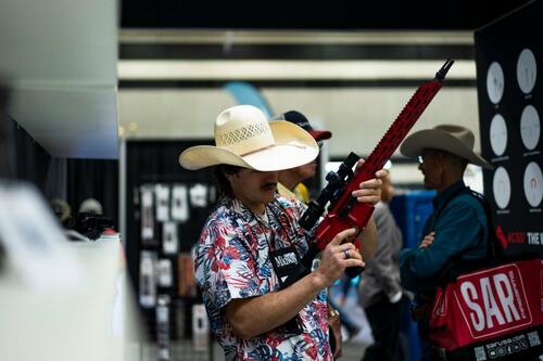People try out firearms at the National Rifle Association exhibits at the Kay Bailey Hutchison Convention Center in Dallas on May 18, 2024. Madalina Vasiliu/The Epoch Times