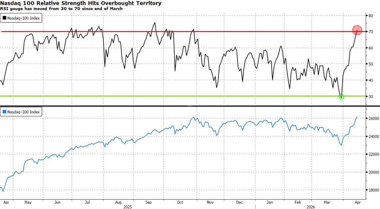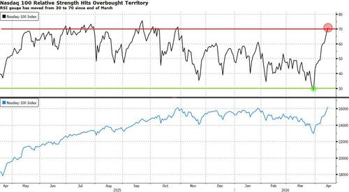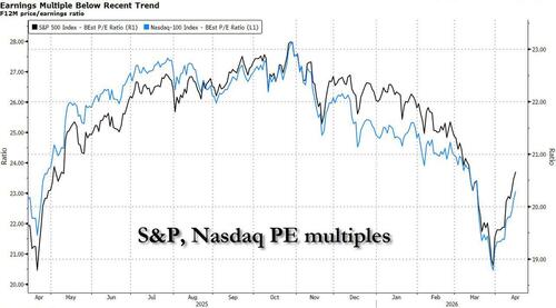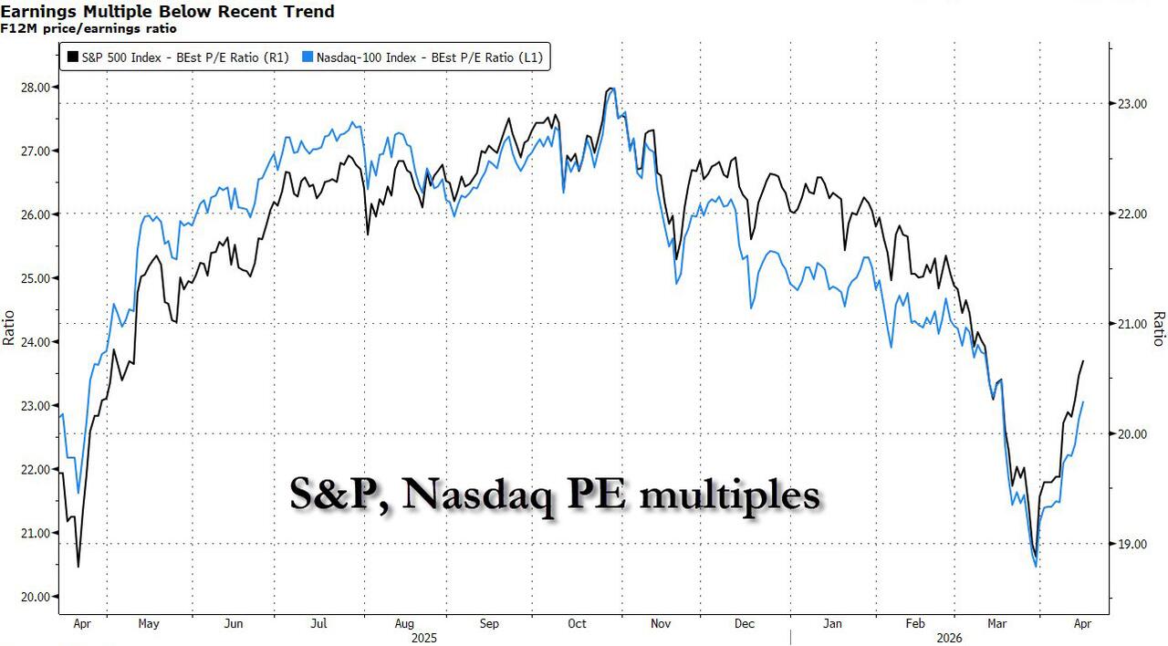 Stock markets have rebounded as signs of easing tensions in the Middle East, combined with a fresh burst of AI optimism and corporate earnings, pushed investors to abandon their cautious views. Sentiment was boosted by lack of bad Iran news again: this time, the US and Iran are said to be considering a two-week ceasefire extension to allow more time to negotiate a peace deal; the next meeting between US / Iran may take place later this week with chatter from Pakistani media that Trump is said to be in attendance. April’s strong stock rebound is being driven by a new kind of FOMO, the fear of missing out on peace, according to Ed Yardeni, who said that for stocks, the V-shaped recovery this month makes it feel “like the Roaring 2020s are back.” Still, while equities are “definitely pricing” the end of the war, we are “not there yet,” cautioned HSBC’s Patrick George. The IMF and World Bank are also worried that markets are underestimating the war’s economic damage.
