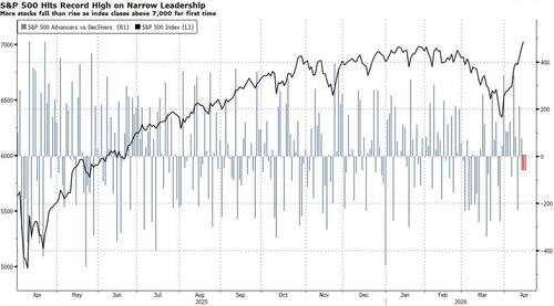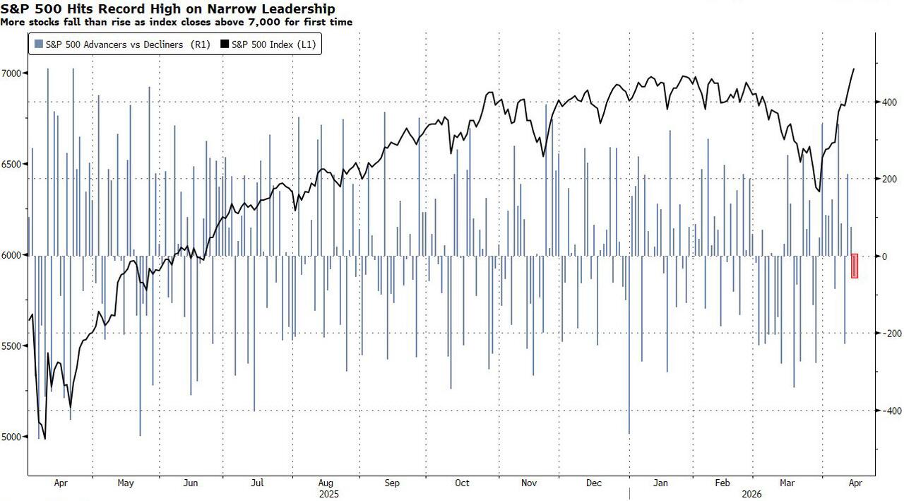 While the S&P 500 hit a new record on Wednesday, valuation ratios are still well below the levels seen in late 2025, indicating that earnings forecasts are moving up faster than stock prices. The current 12-month forward blended PE multiple for the S&P 500 of about 21 times compares to a peak of 23 times in November. The rally is also without breadth, with more decliners than advances as the gauge passed 7,000.