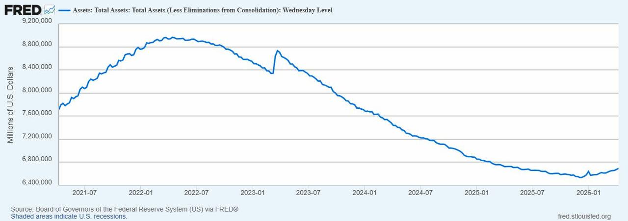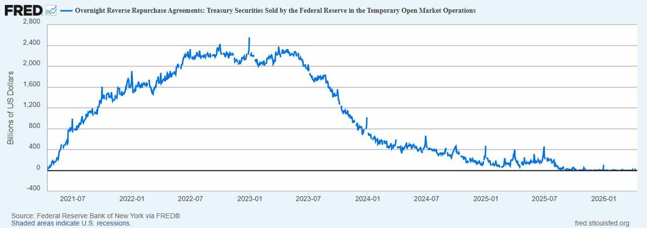From the peak in June 2022 to the trough in December 2025, the asset side of the Fed’s balance sheet shrank by roughly $2.3 trillion. That was the front door. But through the back door, something else was happening on the liability side: the Fed’s Overnight Reverse Repo Facility (RRP) was releasing $2.5 trillion of previously frozen private liquidity back into the financial system.