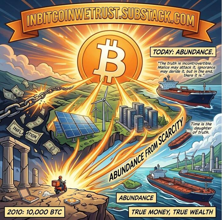 As Bitcoin holders, we cease to be the victims of hidden inflation taxes. Instead, we become the direct beneficiaries of technological abundance. We capture that abundance in the form of exponentially greater purchasing power. The transformation of a 10,000 BTC stack from two pizzas to a fleet of supertankers is not a glitch; it is the correct mathematical repricing of the world against a true, unmanipulated denominator.