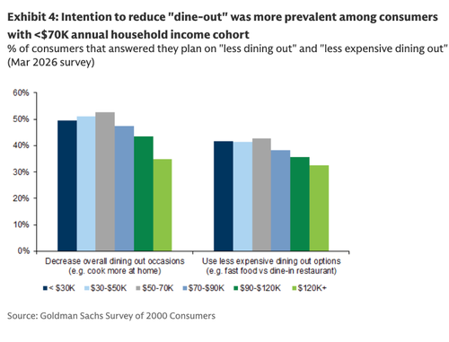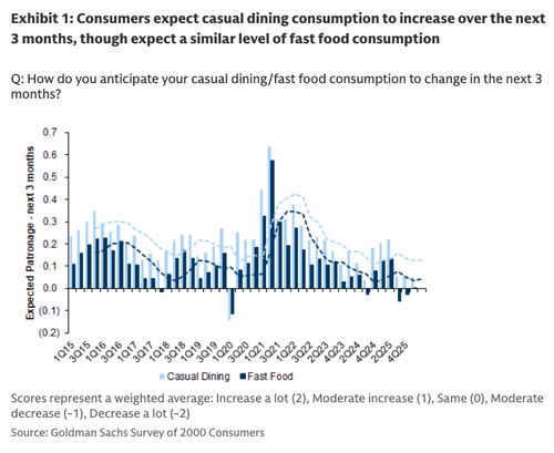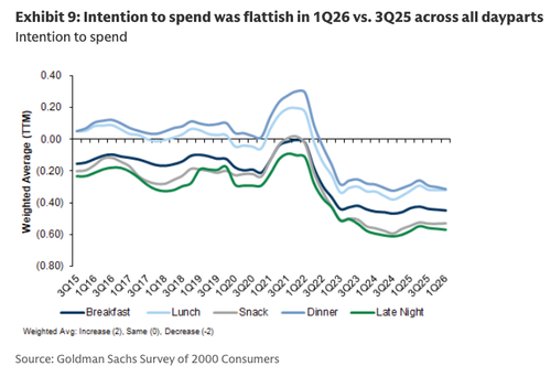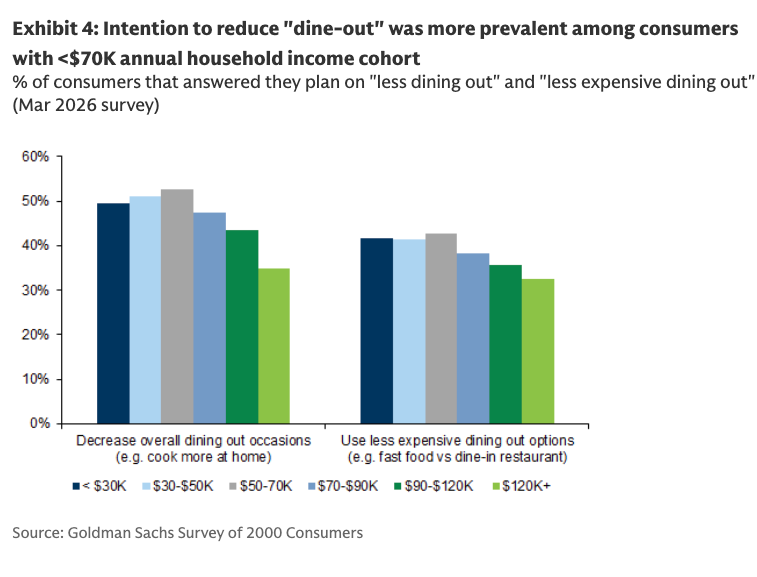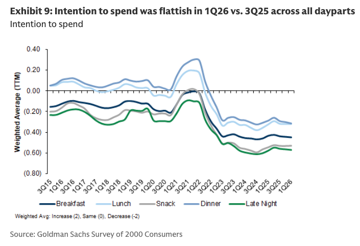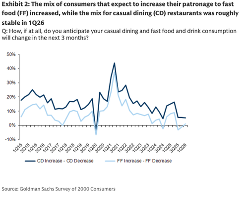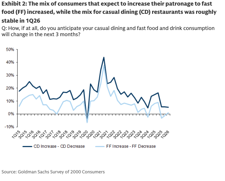 Goldman analyst Christine Cho has published her latest quarterly survey of 2,000 consumers for 1Q26, pointing to a softer restaurant environment. Muted demand backdrop suggests that the K-shaped economy continues to fester, with working-poor consumers still facing the greatest downward pressure.