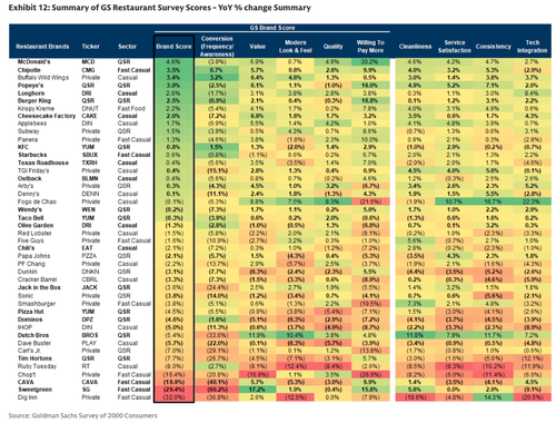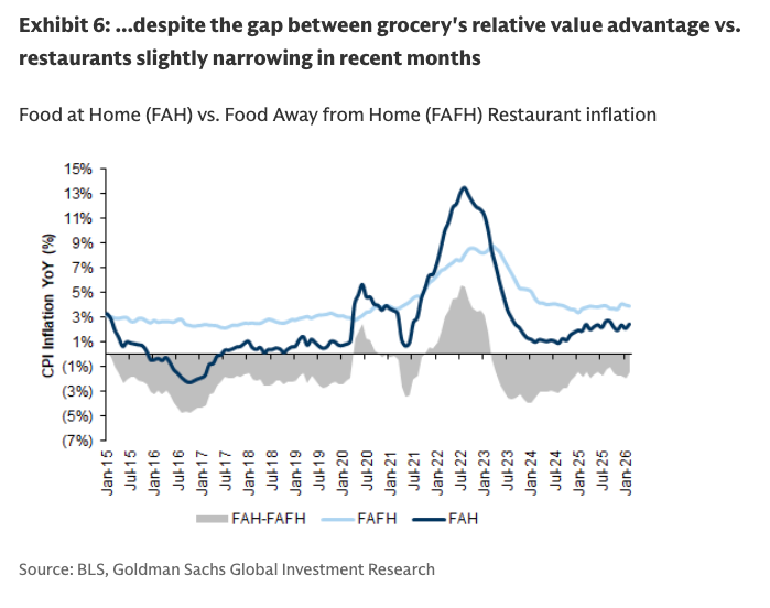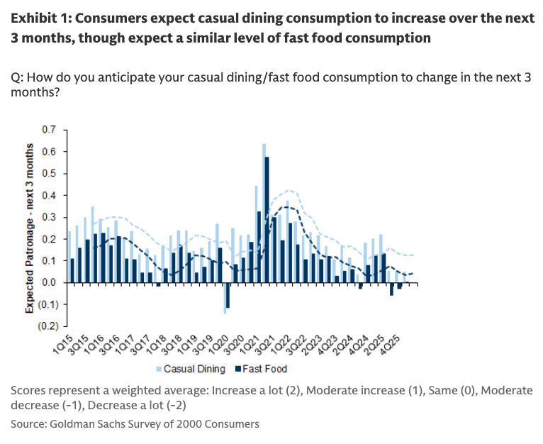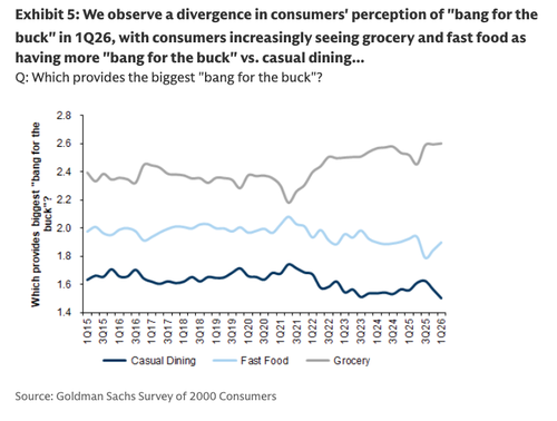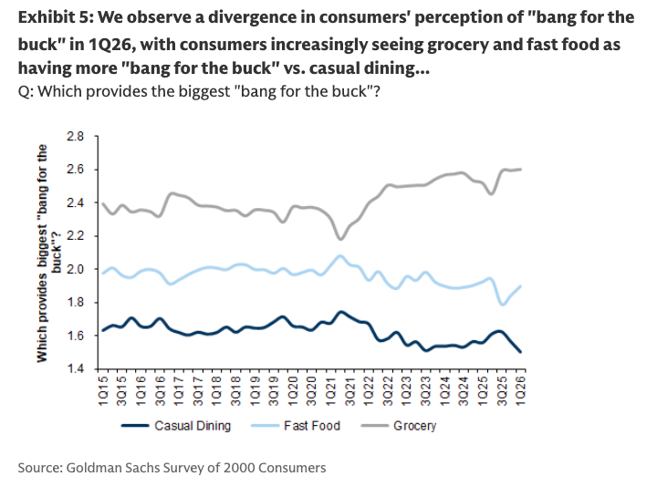 Another key takeaway is the growing divide in perceptions of value. Fast food’s “bang for the buck” has improved since 3Q25, while casual dining’s value perception has deteriorated to the lowest level in Goldman’s dataset.