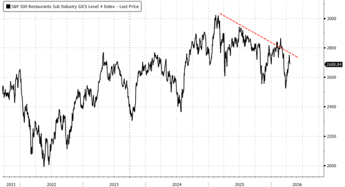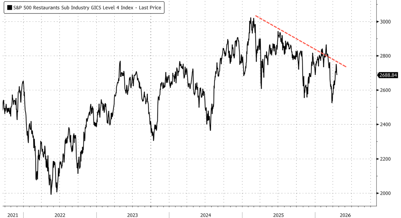 The S&P 500 Restaurants Sub-Industry Index has largely traded sideways since early 2025.