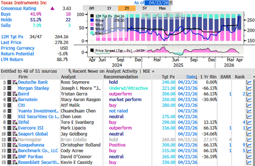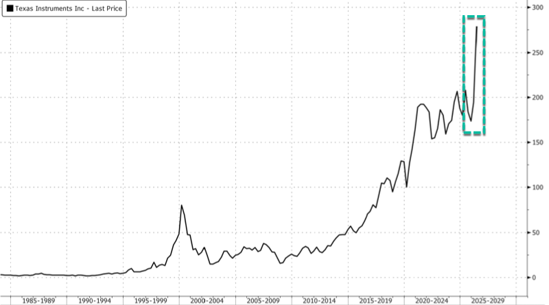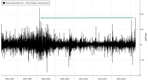 Shares of Texas Instruments jumped the most since the Dot-Com bubble era after the chipmaker issued a stronger-than-expected second-quarter forecast, signaling that demand is rebounding across industrial markets and data centers. Goldman analysts told clients the guidance suggests the “analog recovery is continuing.”