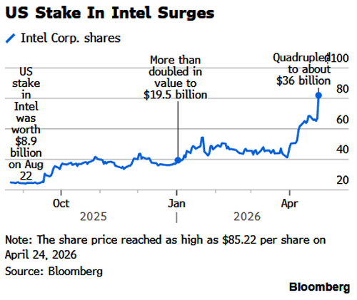 According to Bloomberg, those 433.3 million Intel shares owned by taxpayers are now worth a staggering $36 billion, netting taxpayers a $27 billion paper gain.