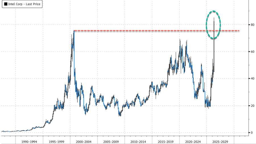 Earlier, Intel shares jumped as much as 28%, rocketing to a record high and eclipsing their Dot Com peak, as Wall Street analysts cheered the earnings report as evidence that the chipmaker’s turnaround is gaining traction.