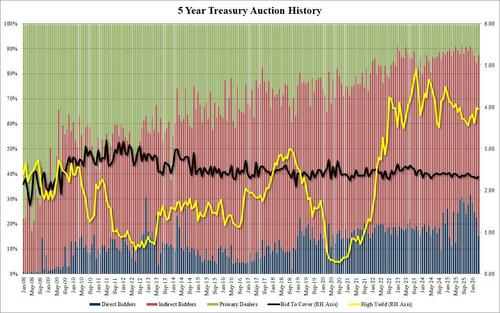 After a mediocre 2Y auction to start the week’s coupon issuance this morning, moments ago the Treasury sold 5Y notes in another average auction.