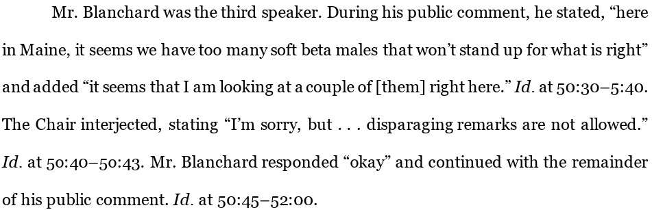 During [Mr. Blanchard’s] public comment, he stated, “here in Maine, it seems we have too many soft beta males that won’t stand up for what is right” and added “it seems that I am looking at a couple of [them] right here.” The Chair interjected, stating “I’m sorry, but … disparaging remarks are not allowed.” …