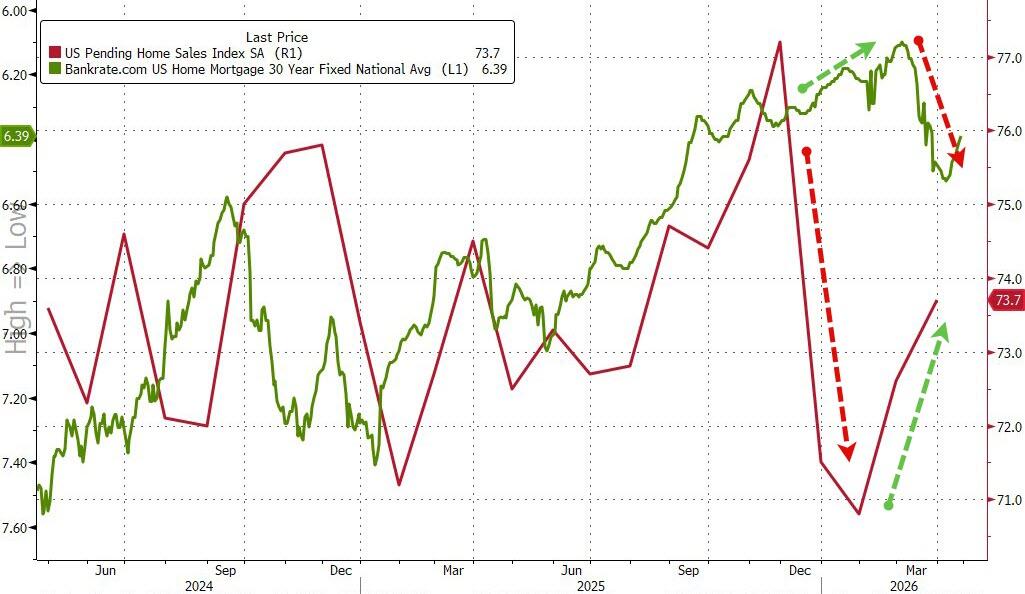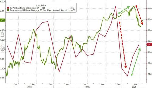 While mortgage rates did pick up at the start of March (Iran War), pending home sales have been disconnected from improving ‘affordability’ in recent months…