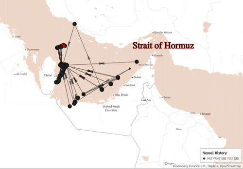 The latest ship-tracking data from Bloomberg shows that Hai Yang Shi You (285) has transited around the Gulf region, particularly around Qatar and the United Arab Emirates, over the last 60 days.
