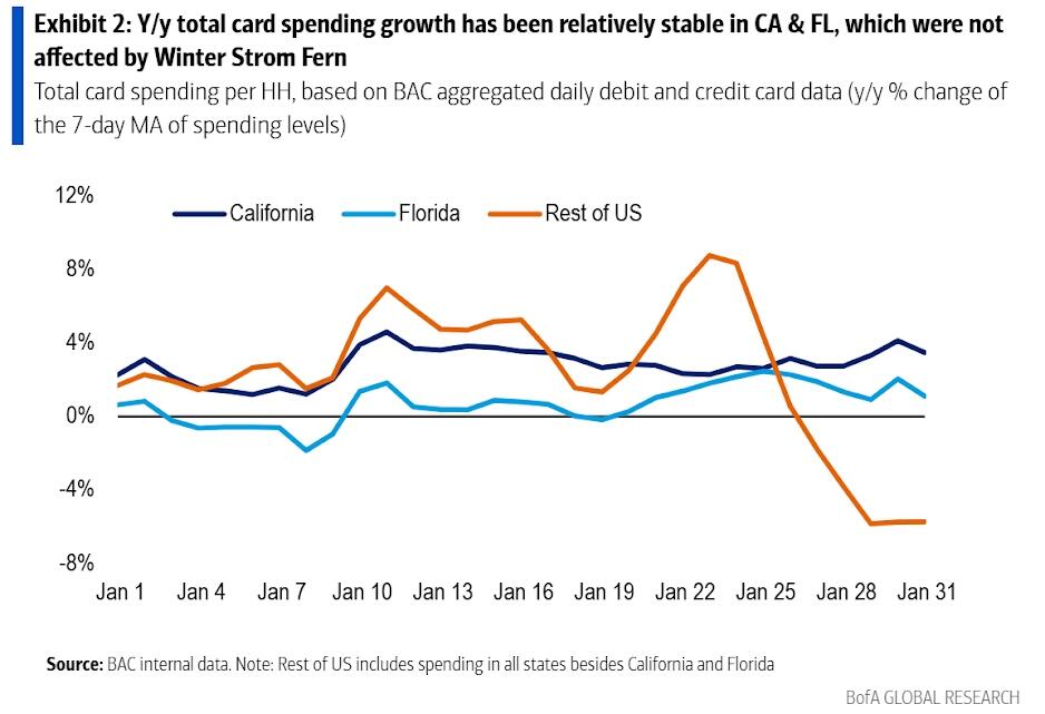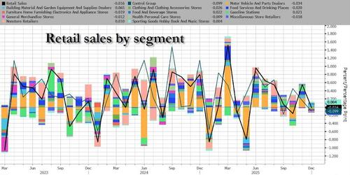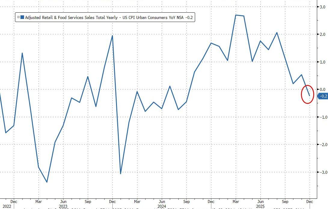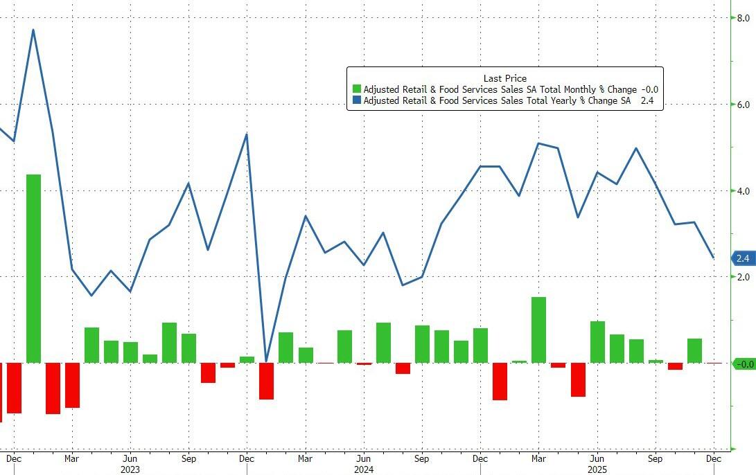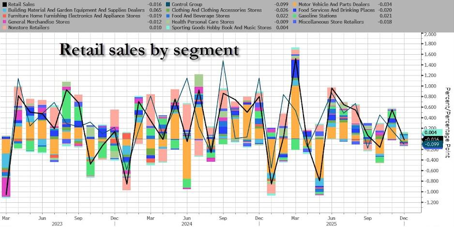 US equity futures are lower, reversing earlier gains and trading near session lows in a narrow, jitter overnight session as traders prepare for a heavy slate of earnings and readings of consumer sales and small-business due later. As of 8:15am ET, stock futures were muted, down 0.1% after earlier rising 0.2% and approaching last month’s record levels after an artificial-intelligence-driven selloff and subsequent rebound over the past week. Nasdaq futures drop -0.2% with small caps outperforming as bond yields drops by 1-3bps and the USD is flat. The downbeat mood doesn’t match the bullish tone in Asia, where stocks hit fresh records while European bourses are green across the board. Pre-market, Mag 7 are mixed, Semis are bid with SMH leading IGV as TSMC sees revenue +37% YoY in Jan. Financials and Industrials are leading Cyclical outperformance with healthcare the best performing sector within Defensives. Commodities are weaker but with vol lower, it appears to be profit-taking than what we have seen YTD. Today’s macro data focus is on Retail Sales, weekly ADP, Small Biz Survey, and Import / Export prices.