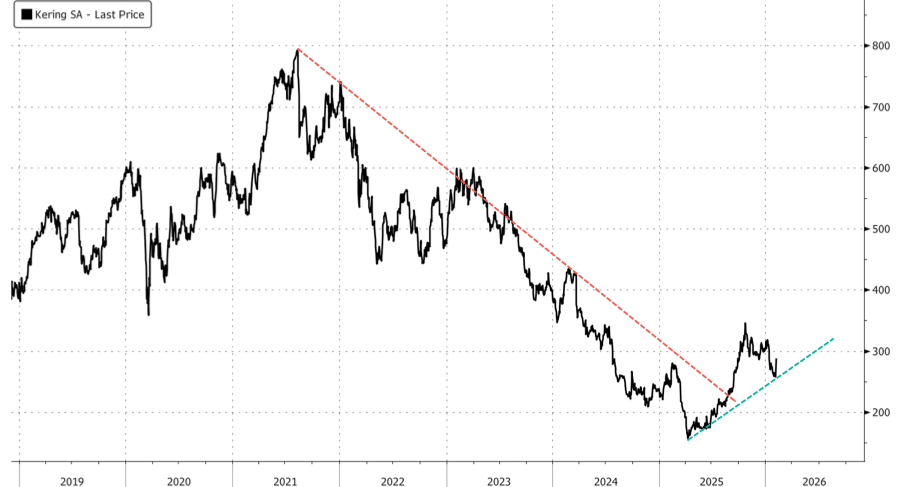 - Kering shares gain as much as 14%, the most since March 2020, on hopes that the French luxury group is returning to a path to growth following better-than-expected fourth-quarter sales at its Gucci unit.
